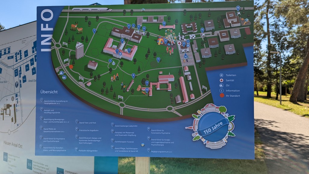 Les Suisses savent très bien organiser des fêtes. L’attraction principale était … un jeu de piste. Voici le plan du site. Il fallait trouver un mot composé de plusieurs lettres et syllabes dont la solution se trouvait sur les différents stands. La solution était Zeitreise, voyage dans le temps.