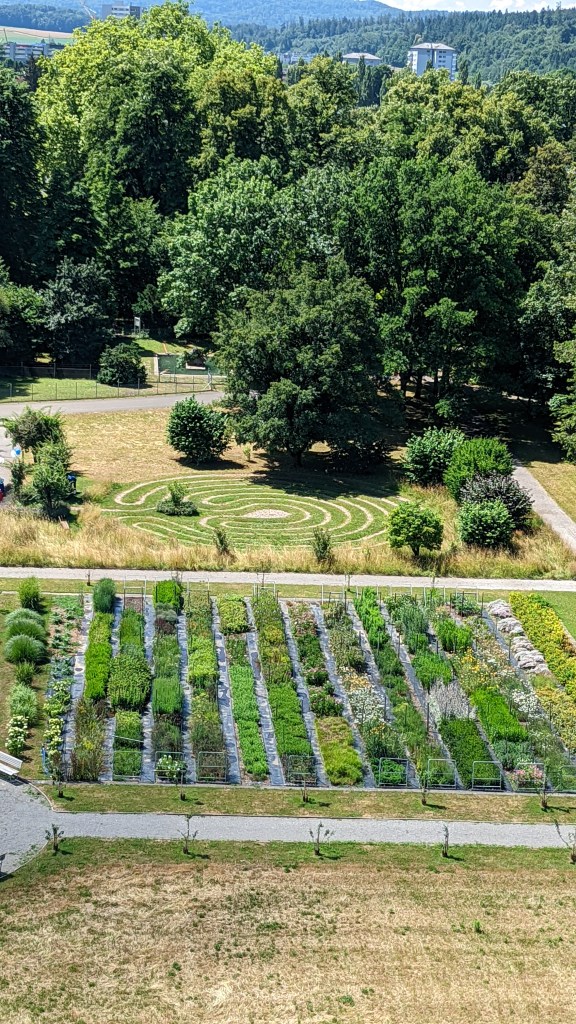On voit bien le labyrinthe où avait traditionnellement lieu la fête du solstice d’hiver, ainsi que les jardins.