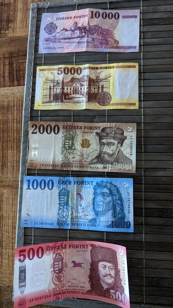 En attendant de pouvoir emménager dans notre AirBNB, nous laissons nos bagages à la consigne de la très belle gare. Passage obligé au bureau de change, étant donné que la monnaie locale est le florin. Surprenant de recevoir des billets de 10000 florins. On se croirait au Monopoly!