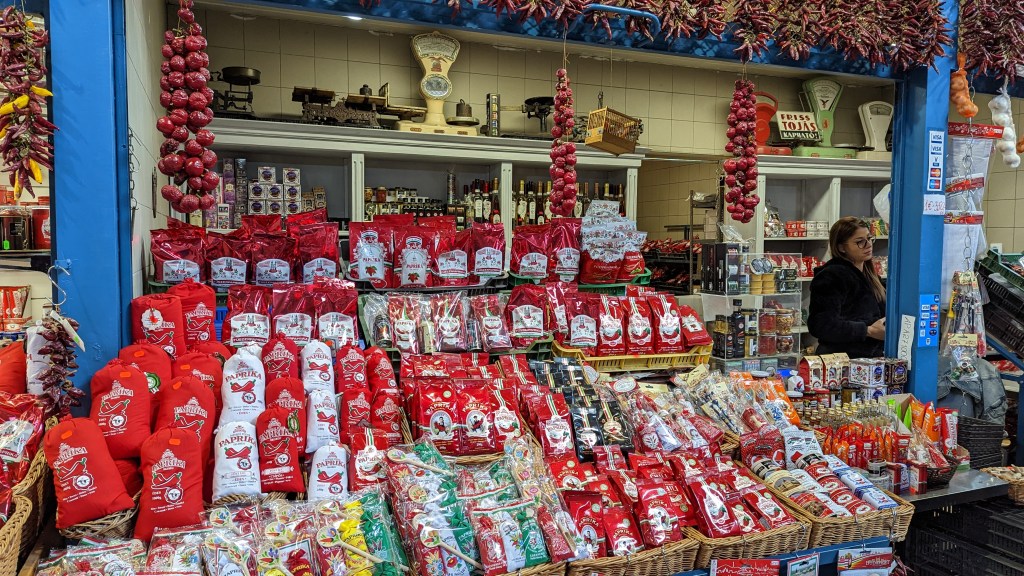 Vendredi dernier jour de vacances. Nous retournons au grand marché couvert pour faire le plein de paprika. C’est présenté dans de jolies boîtes. Le petit cadeau de Noël idéal de ma femme à ses nombreuses amies.