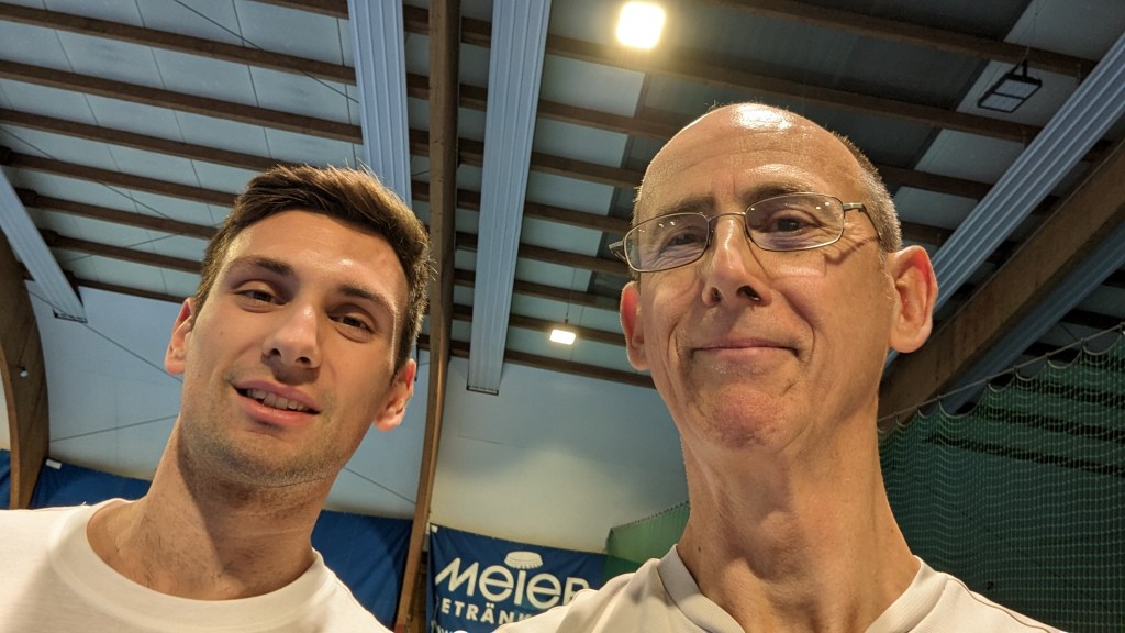 J’ai fait exactement un entraînement avec mon ancienne équipe du TC Bremgarten, en remplaçant un joueur ayant mal au dos ce jour-là. Petite anecdote marrante… le joueur un peu handicapé est venu en spectateur en fin du match d’entraînement alors que je jouais en double contre son frère jumeau. Il a claironné « faute de pied » sur un de mes services au jeu décisif final. Cela ne se fait pas à notre niveau, où les fautes de pied sont plutôt la norme… Pas fair-play. J’avais encore un service sur le partenaire du jumeau. Ace… et question lancée au spectateur : « et là, il y avait aussi faute de pied ? »… Trois balles plus tard j’ai conclu sur un bon smash en guise de balle de match. Soirée réussie, mais niveau encore insuffisant au goût du capitaine.