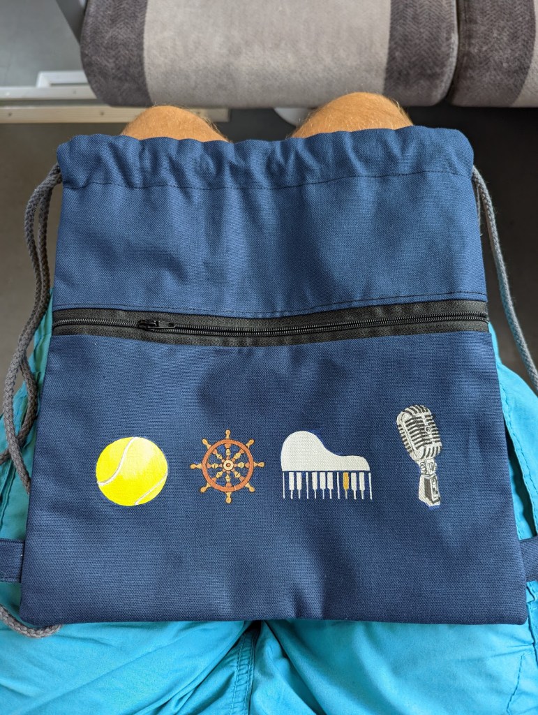 Et voilà mon nouveau sac à dos avec mes loisirs préférés, fait et peint à la main en Alsace.