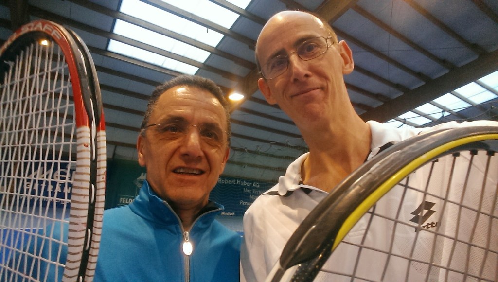 Le prof de tennis du club de Calvi est un coup de chance. Mon avis, c’est qu’en Suisse, les profs de tennis sont soit de bons entraineurs pour de jeunes joueurs, ou plutĂ´t passifs et pas vraiment utiles pour des joueurs âgĂ©s. C’est illusoire pour moi d’essayer d’adopter la technique parfaite du pro. C’est mĂŞme contre-productif. Un prof qui m’observe, m’Ă©coute, me donne des pistes, et surtout Ă©change par une discussion sur mes sensations est beaucoup plus efficace pour mon dĂ©veloppement.