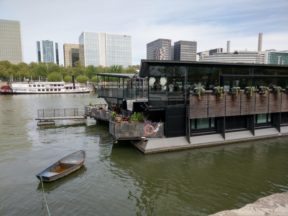 Après avoir mangé copieusement dans un petit fast-food turc, nous nous dirigeons vers l’hôtel. Bientôt arrivés sur le pont sur la Seine, nous voyons l’hôtel, mais également une péniche discothèque juste en face. L’hôtel est vraiment situé directement sur la Seine, avec une passerelle pour y accéder, ainsi qu’une bouée de sauvetage…!